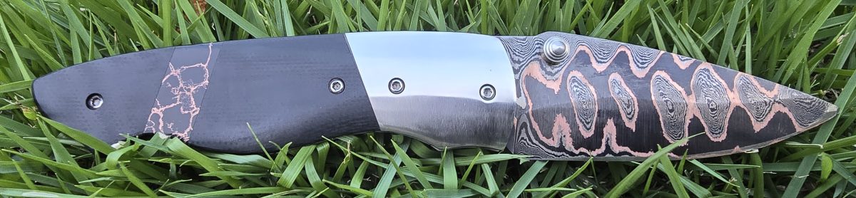 First pocket folder. CuMai blade, stainless bolsters, handle is G10 and copper webbed trustone. Leave a reply